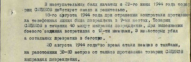Мой прадедушка Сыщиков Федор Николаевич был на войне связистом: он прокладывал новую и ремонтировал испорченную связь, рискуя жизнью. Прадедушка имел много наград: медаль «За отвагу», медаль «За боевые заслуги», Орден Красной Звезды. 18 августа 1944 года он восстанавливал поврежденную телефонную линию, и во время выполнения задания встретил 12 немцев, трое из которых убил, остальных обратил в бегство. С заданием справился.