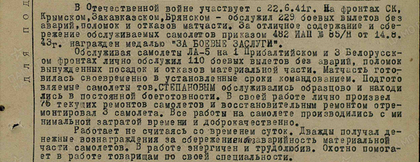 В Великой Отечественной войне из нашей семьи воевали многие. Хочется особенно отметить прадедушку и прабабушку по маминой линии и прадедушку по папиной. Прабабушка и прадедушка воевали в истребительном авиационном полку. Прабабушка Ульяна Дмитриевна занималась обслуживанием авиационного вооружения. Ей нужно было правильно устанавливать и закреплять оружие на самолетах. Моя прабабушка имела различные награды, в том числе медаль «За боевые заслуги». Мой прадедушка Николай Герасимович был авиационным механиком, он ремонтировал поврежденные самолеты в любую погоду и в любое время суток. Он награжден медалью «За боевые заслуги» и Орденом Красной Звезды. Мои прадедушка Степанов Николай Герасимович и прабабушка Данченко Ульяна Дмитриевна прошли всю войну и дошли до Берлина. 9 мая 1995 года они были приглашены в Москву на торжественный парад, посвященный пятидесятилетию со дня Победы в Великой Отечественной войне.