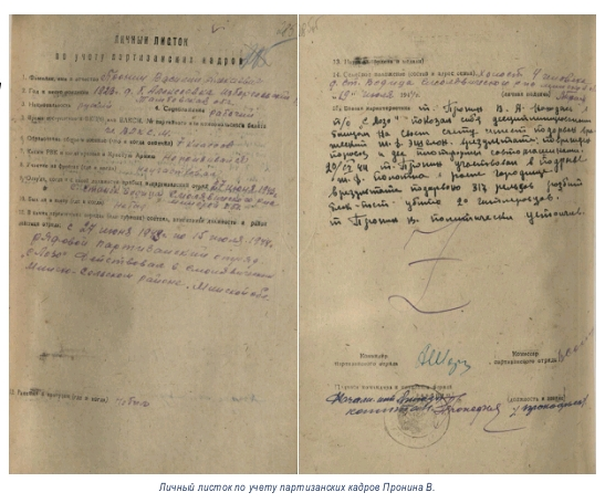 - Пронин Василий (средний сын) остался в партизанском отряде имени Лазо (бригада «За Советскую Белоруссию»). Когда в 1944 году освободили Минск, его призвали в действующую армию. Он прошёл с боями Польшу, получил тяжёлое ранение под Кёнигсбергом. За боевые заслуги Василий был награждён:
