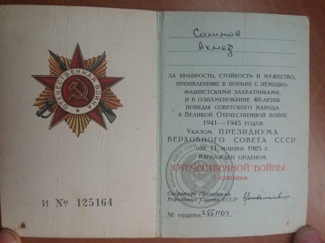 За мужество и самоотверженность Ахмед Салимов был награждён Орденом Отечественной войны I степени (Указ Президиума Верховного Совета СССР от 11 марта 1985 года). Эта награда — одна из самых почётных в СССР — была присуждена ему за героизм в борьбе с немецко-фашистскими захватчиками и трудовой подвиг в послевоенные годы. В память о его героизме и мужестве весь наш род, начиная с дедушки (самого младшего сына Салимова Ахмеда), носит его имя как фамилию.